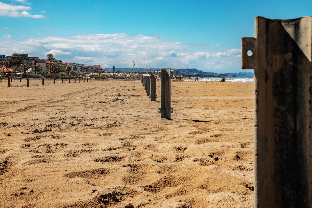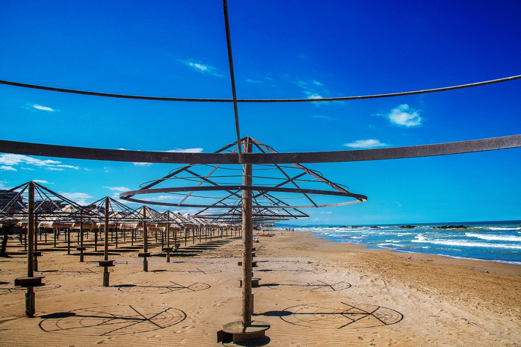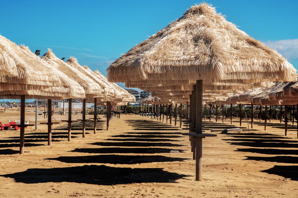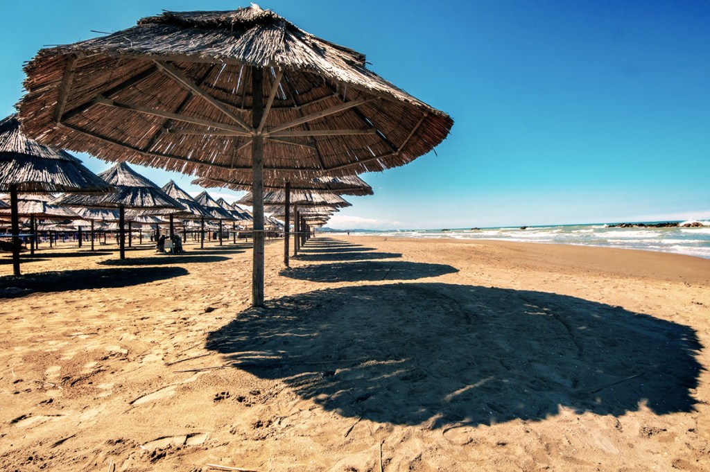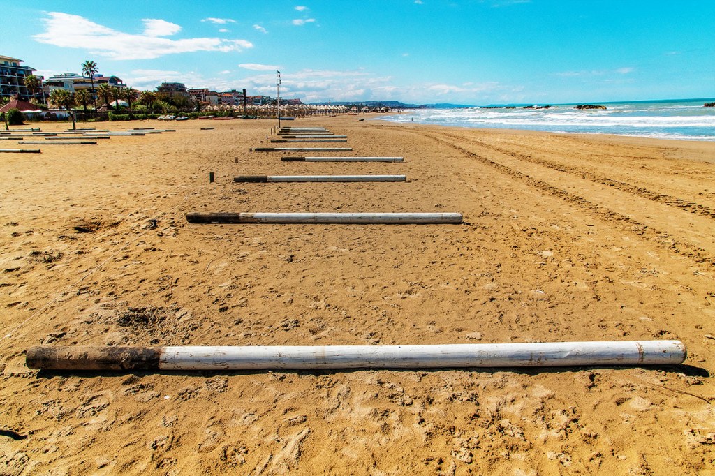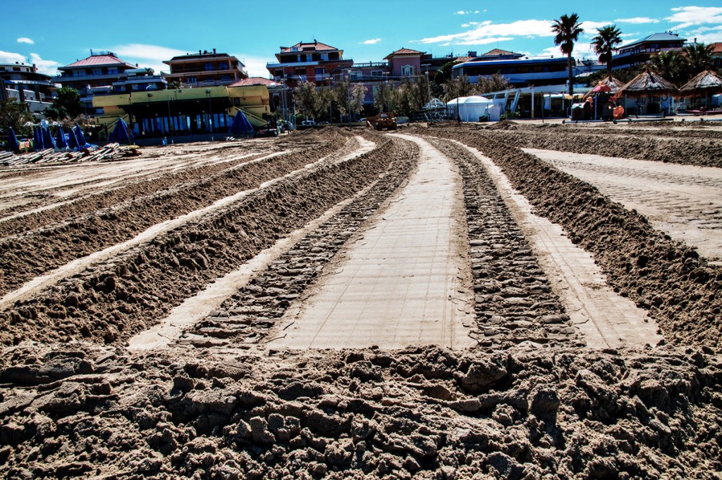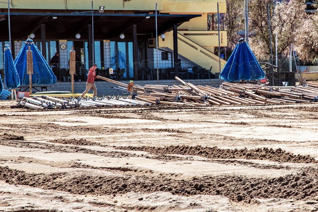 La preparazione alla stagione estiva comincia con la pulizia della spiaggia il montaggio degli ombrelloni